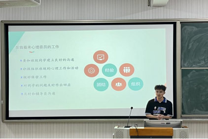 紧接着,主持人介绍答辩要求:选手依次上台进行3分钟风采展示,及1分钟评委提问答辩环节。每位参赛选手依次上台展示和答辩,他们以PPT展示及演讲的方式展示了自己在学习、工作、生活等方面的情况及取得的成绩,阐述了自己认为从事心理工作具备的特质和能力,如较强的组织协调沟通能力、足够的耐心和同理心、强大的心理素质、认真的工作态度、较强的自我约束管理能力等等,也展示了在从事心理委员或干部期间所参加的培训、学习、活动等,取得了一些成绩,也让身心都得到了放松,感觉很快乐。