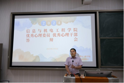 2024年5月8日19:00,为提高我院大学生心理干部的积极心理品质、心理韧性和综合能力,鼓励学生们积极探索自我,让学生真正了解自己的心理状态,温柔待已,积极向上健康成长,信息与机电工程学院举办了2023-2024届“优秀心理委员、优秀心理干部答辩会”,学院党总支书记唐志文莅临指导,党总支副书记吴彬、组织员匡希茜、团总支书记邱涛、工心协指导老师左春华、学生党支部书记姜雅槐老师、陈辉湘老师及工心协会长黄家萱、副会长杜文鑫、活动部部长胡泰担任评委。