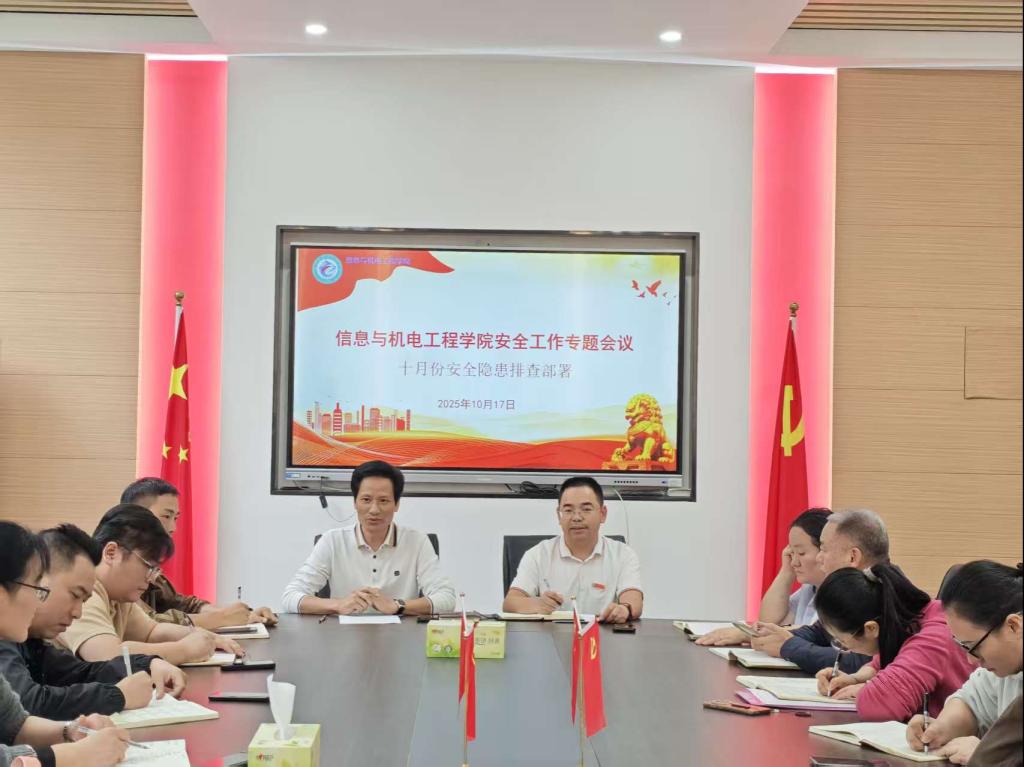 2024年10月17日上午,信息与机电工程学院召开安全工作专题会议暨十月份安全隐患排查部署会。会议由党总支书记唐志文主持,学校保卫处处长夏武科应邀做主题讲座,学院实验中心主任、全体辅导员参加会议。