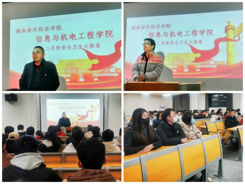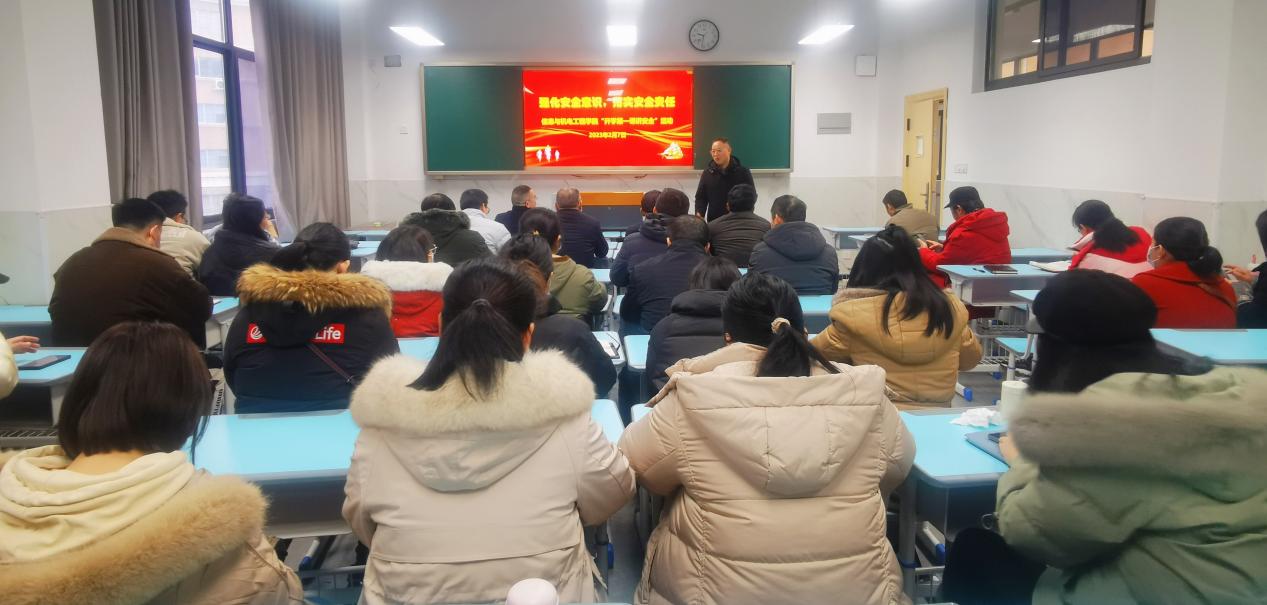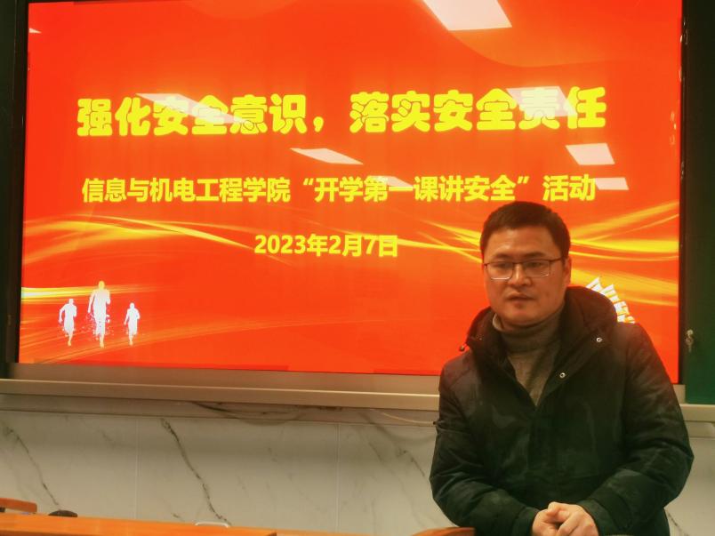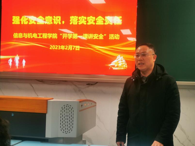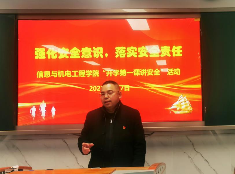 为了深入贯彻落实全国全省安全生产电视电话会议精神,推动压实教育安全主体责任,确保春季开学校园安全稳定,2月7日下午,信息与机电工程学院联合安全保卫处举办了题为“强化安全意识,落实安全责任”的“开学第一课讲安全”活动。学院全体管理干部、辅导员、实验室管理人员参加了此次活动。