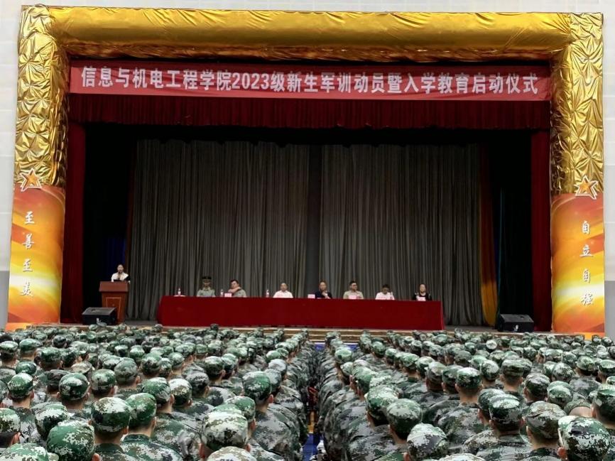 9月15日上午,信息与机电工程学院在体育馆隆重召开2023级新生军训动员会。学院领导、大一新生辅导员、军训教官和2023级全体新生参加。会议由沈思雨主持。