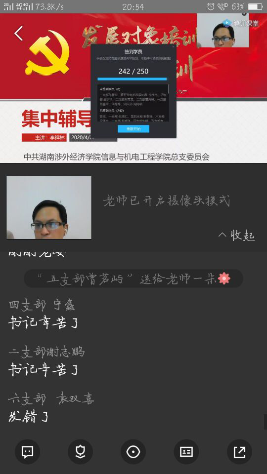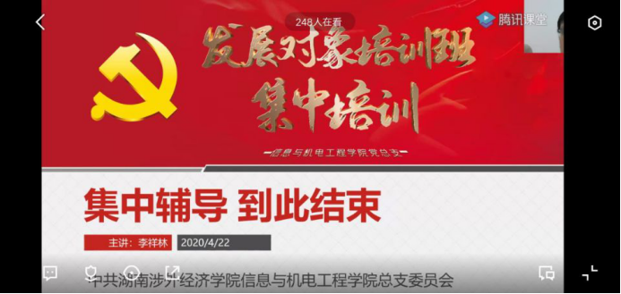 为了提高保证党员的发展质量,确保真正做到“成熟一个,发展一个”的目标,加强新一批发展对象自身素质,4月22日晚七点三十分,我院于腾讯课堂举行了2020 年上半年发展对象第一次集中辅导,本次辅导的内容是“总支委员会党员发展考核细则”以及“中国共产党发展党员工作细则”。会议由李祥林副书记主讲,全体发展对象与会学习。