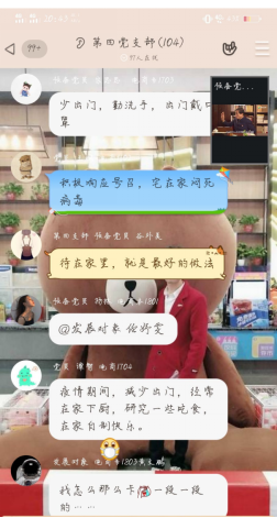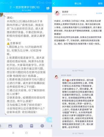 党课上,同志们通过观看党员坚守抗击疫情前线的视频进行学习。视频中,让我们记住了冲锋在前、与病魔作殊死搏斗的广大医护人员;让我们记住了主动请缨的各地医疗队;让我们记住了在一线疫情监测、排查、预警和联防联控、科研攻关、物资保障、交通管理、舆论引导的广大共产党员……通过视频学习,左春华老师表示:“作为一名党员,特殊时期要接受特殊挑战,要勇于承担责任,要有爱国爱民的情怀,要‘守土有责,守土担当,守土尽责’,作为学生党员,在家学习克服自身困难的同时,也要发挥党员先锋模范作用,帮助同学们克服困难。”疫情面前,党员们逆行、坚守、奉献。胡芬同志提出问题:“作为一名学生党员,在这次疫情中我们能做些什么?”支肖健同志表示:“作为一名学生党员,应当明确隔离病毒并非隔离爱,防控疫情并非防控遭受疫情围困的同胞,用信心和责任打赢这场胜仗。”申超同志发言道:“在这次战“疫”中,共产党员始终抗击在新型冠状病毒肺炎疫情的第一线,这是在入党时右手握拳宣誓的承诺,也是我们的党性和纪律。我们要向他们看齐,在自己所在的地方,帮助当地做力所能及的事情。”