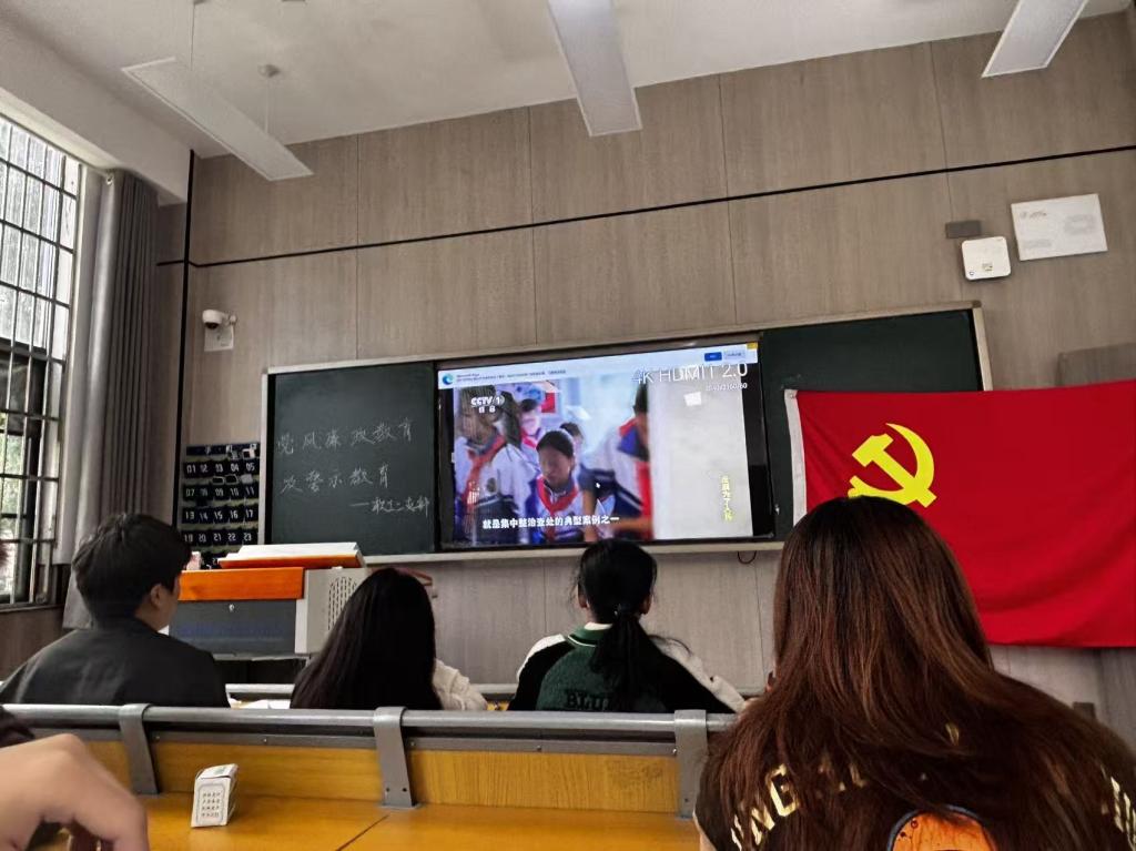 活动现场,教室内党旗高悬,黑板上“党风廉政教育及警示教育”的主题醒目鲜明。