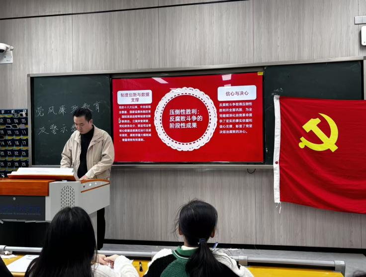 围绕“党风廉政教育的重要性”展开宣讲,从“当前党风廉政建设形势”“廉洁自律要求”等维度,解读了党的二十届四中全会精神,推进党纪学习教育、中央八项规定精神学习教育常态化、长效化,扎实开展新时代高校廉洁文化建设,将廉洁教育深度融入办学治校、教书育人和师德涵养全过程,以廉洁文化涵养校园清风正气。