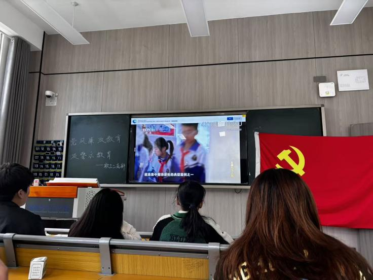活动现场,教室内党旗高悬,黑板上“党风廉政教育及警示教育”的主题醒目鲜明。