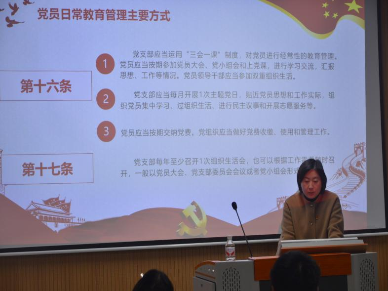 紧接着,徐莲静老师对第五章关于党与党员组织的阐释,强调党支部应运用“三会一课”制度对党员进行教育管理。党员需定期参与党员大会、党小组会及党课,党员领导干部应参加双重组织生活。党支部每月开展主题党日活动,党员应按时缴纳党费,党组织做好党费管理。党组织应组织党员参加党内集中学习教育,省级党委、行业系统党组织可适时开展专题学习教育。党组织应发挥党员先锋模范作用,鼓励党员参与志愿服务。党组织应坚持从严教育管理与关心爱护相结合,对老党员、体弱党员采取灵活方式,给予关心照顾。