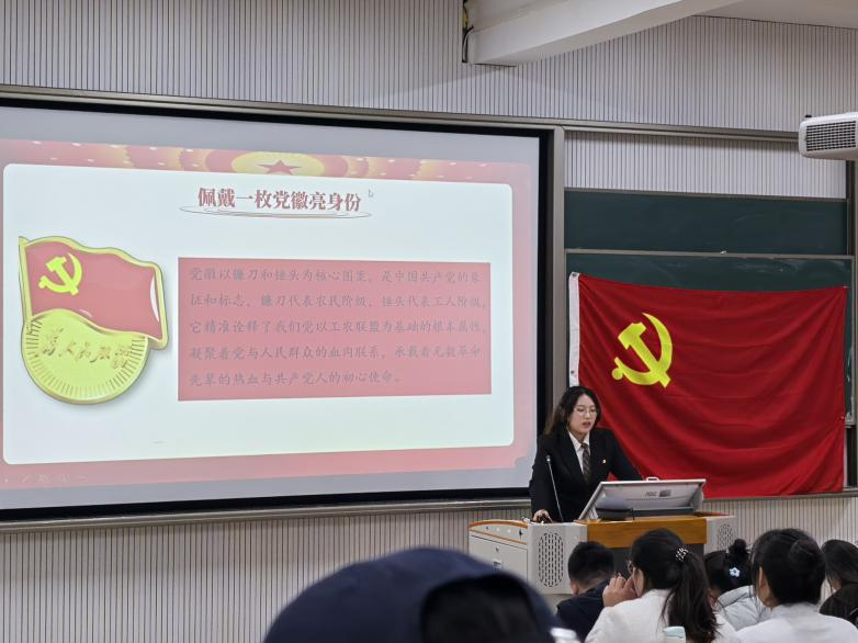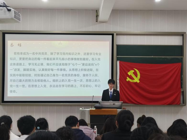 在“佩戴党徽亮身份”环节,各发展对象结合自身经历,畅谈佩戴党徽、主动亮明身份的过程中,那份愈发清晰的责任与沉甸甸的担当。软工二支部于越表示:“党徽不仅是一种标识,更是一面镜子,时刻提醒我言谈举止要符合党员标准,在课堂、宿舍、校园每个角落都要起到表率作用。”