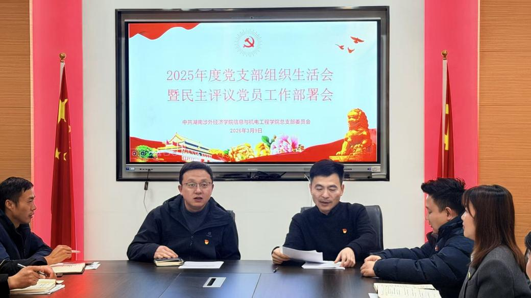 3月9日17时,信息与机电工程学院党总支理论学习中心组(扩大)集中学习暨民主生活会会前专题学习研讨、2025年度党支部组织生活会暨民主评议党员工作部署会在八教107举行。湖南涉外经济学院副校长、信息与机电工程学院院长褚颜魁,学院党总支书记杨建波,党总支副书记陈辉湘,党总支全体委员及全体党支部书记参加会议。会议由党总支书记杨建波主持,本次会议以2025年度党支部组织生活会暨民主评议党员工作部署为核心,同步开展民主生活会会前专题学习研讨。