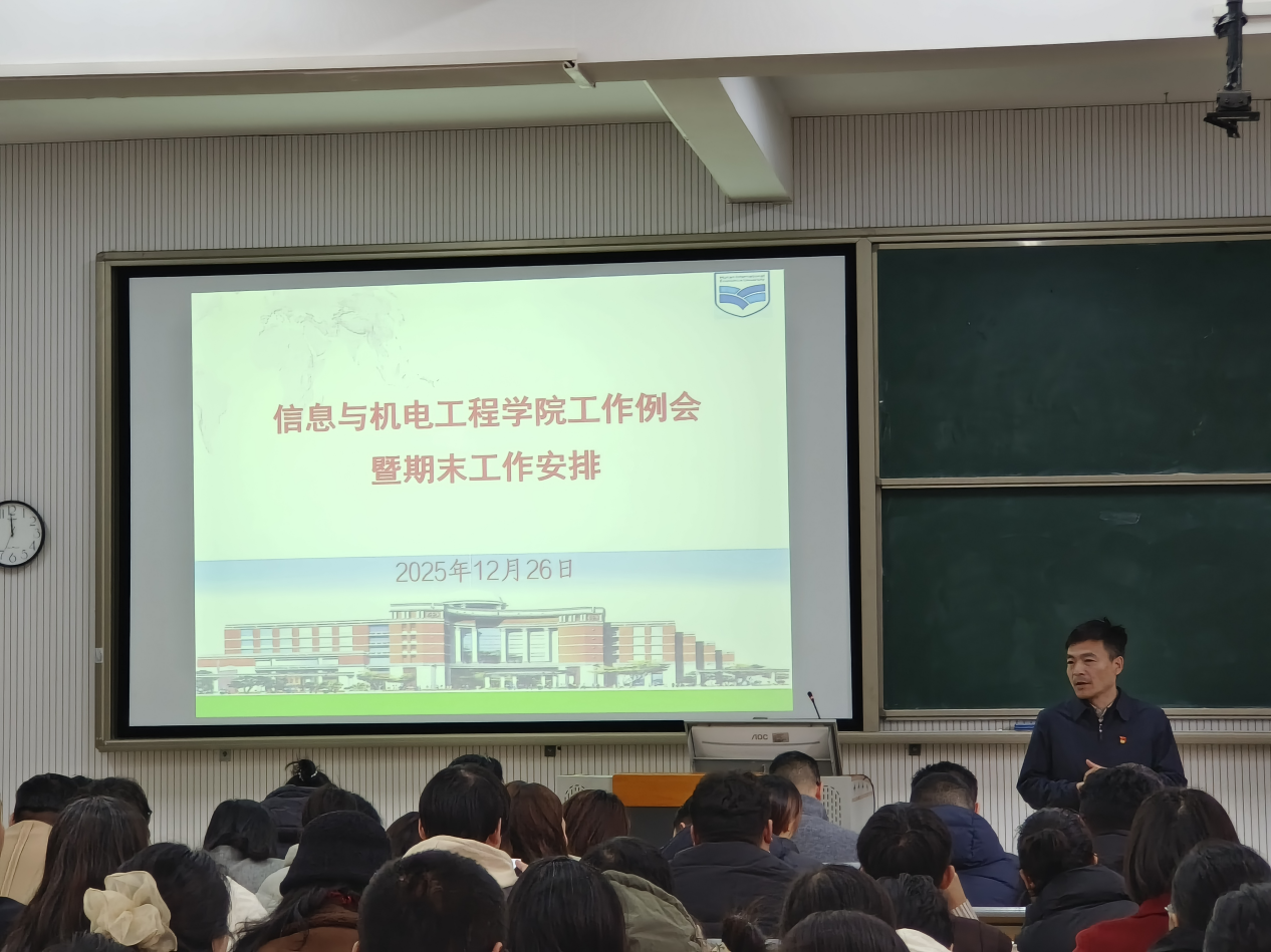 2025年12月26日,信息与机电工程学院在7-105召开全院工作会议,学院书记杨建波及全体教职工参会,副院长彭浩主持会议。这次会议主要围绕两方面展开:期末考试监考安排、试卷批阅规范及期末材料归档工作展开,为本学期教学工作收尾做好充分准备;以及彭浩院总结学院成果。
