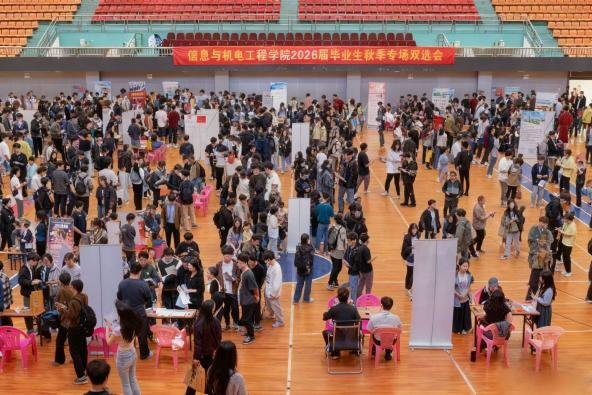 10月16日,“精工筑梦,职等你来”信息与机电工程学院2026届毕业生秋季双选会在学校体育馆成功举办。本次双选会作为信息与机电工程学院2026届毕业首场招聘会共吸引来自长沙、广州、深圳、江浙等地的40多家优质企业参与,其中部分为行业龙头企业和高新技术企业,如保伦电子、硅谷融创、九州华科通讯、广东海大集团等,涵盖计算机、电子信息、智能制造、新能源、自动化等多个行业领域,提供就业岗位达到3400余个,学院2026届毕业生2200余人参加了本次招聘会,招聘后台浏览量达到1.1万余次。